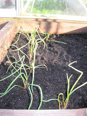 Den franska schalottenlöken, som sattes i höstas, fick spelet när jag la på kanalplast. Nu ser de ut som spagetti och kanalplasten fick tas av igen.